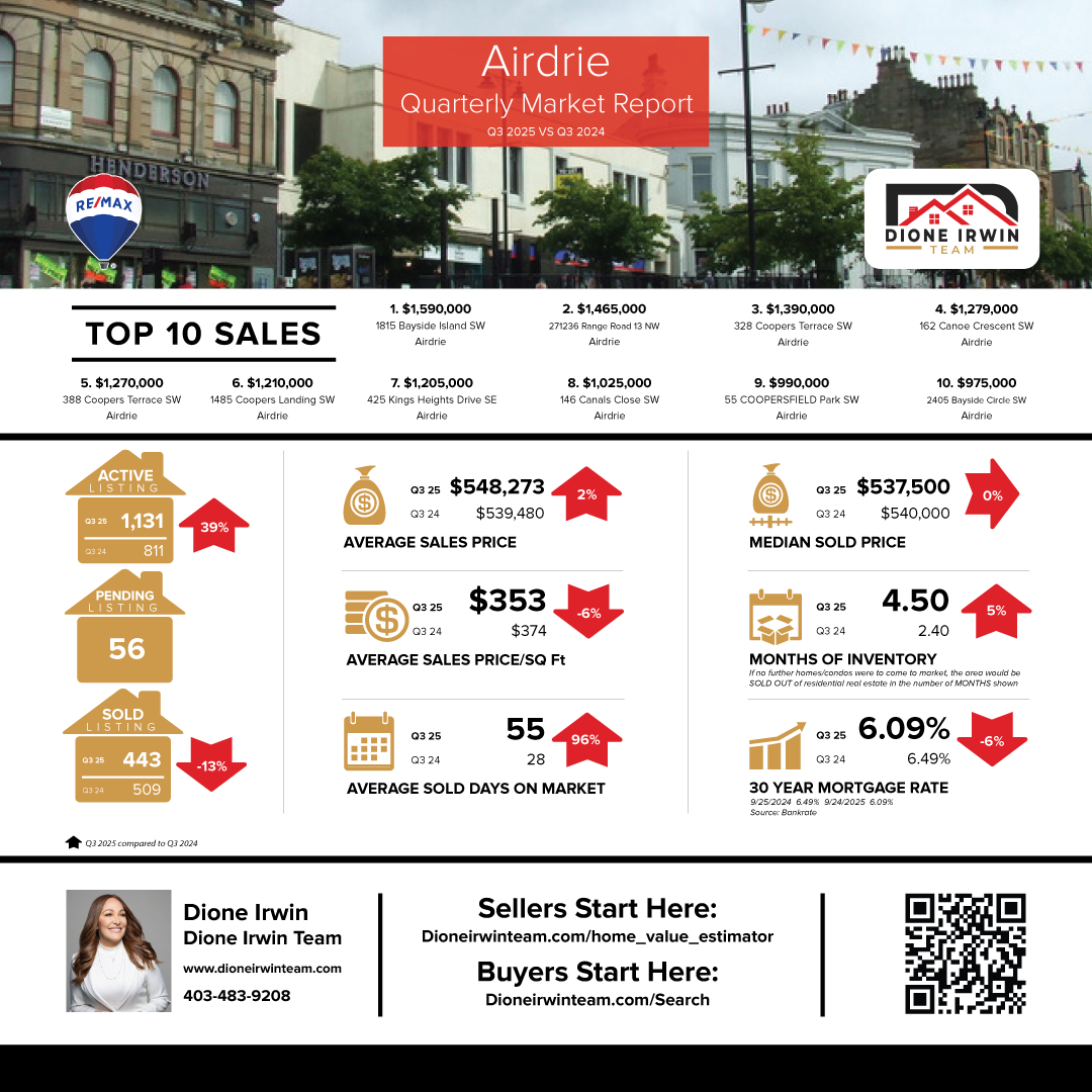The Number of SOLD listings decreased by 13% to 443 properties with a top sale of $1.59 million at 1815 Bayside Island SW in Airdrie.